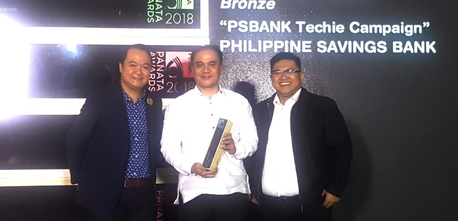 Philippine Savings Bank (PSBank) Senior Vice President & Marketing Group Head Noel Tuazon (center) receives a Bronze Award in Brand Builder Excellence in Brand Positioning category for the bank’s “Techie” campaign at the Philippine Association of National Advertisers’ 2018 PANAta Awards.It Held held recently at the Discovery Primea Suites in Makati. With Tuazon are PANA Executive Director Bobby Simborio (left) and PANA PRO Jake Lugay. PSBank’s “Techie” campaign was intended to communicate the message of simplicity behind the bank’s advanced and innovative banking solutions. The campaign includes a series of ads featuring situations/stories promoting PSBank’s banking solutions that are conveniently simple to use and reliable– all executed with the bank’s brand of humor that’s witty and entertaining.