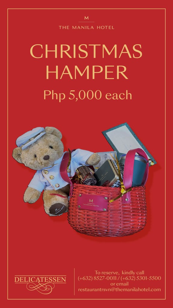 The Manila Hotel Christmas Hamper 2022 will be available starting from November 9, 2022 until December 31, 2022. The Manila Hotel is dedicated to offer the best of the season through exciting deals and unique experiences. For orders and inquiries, call +63 2 8527 0011 or +63 2 5301 5500 or email: restaurantrsvn@themanilahotel.com for orders.
