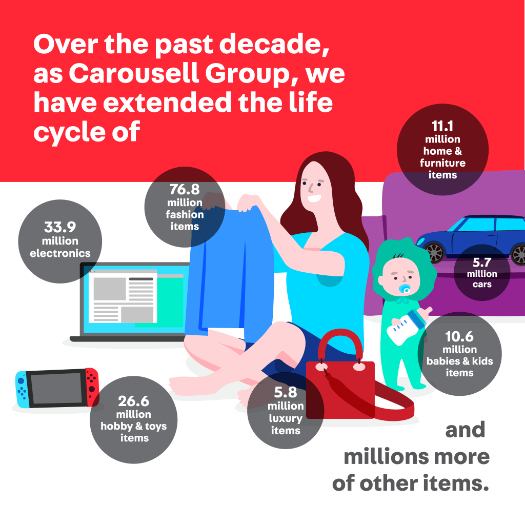 Over the past decade, Carousell Group’s users have extended the life cycle of millions of items, including: 76.8 million fashion items; 33.9 million electronics; 26.6 million hobby items and toys; 11.1 million home items and furniture; and 10.6 million babies & kidsitems.