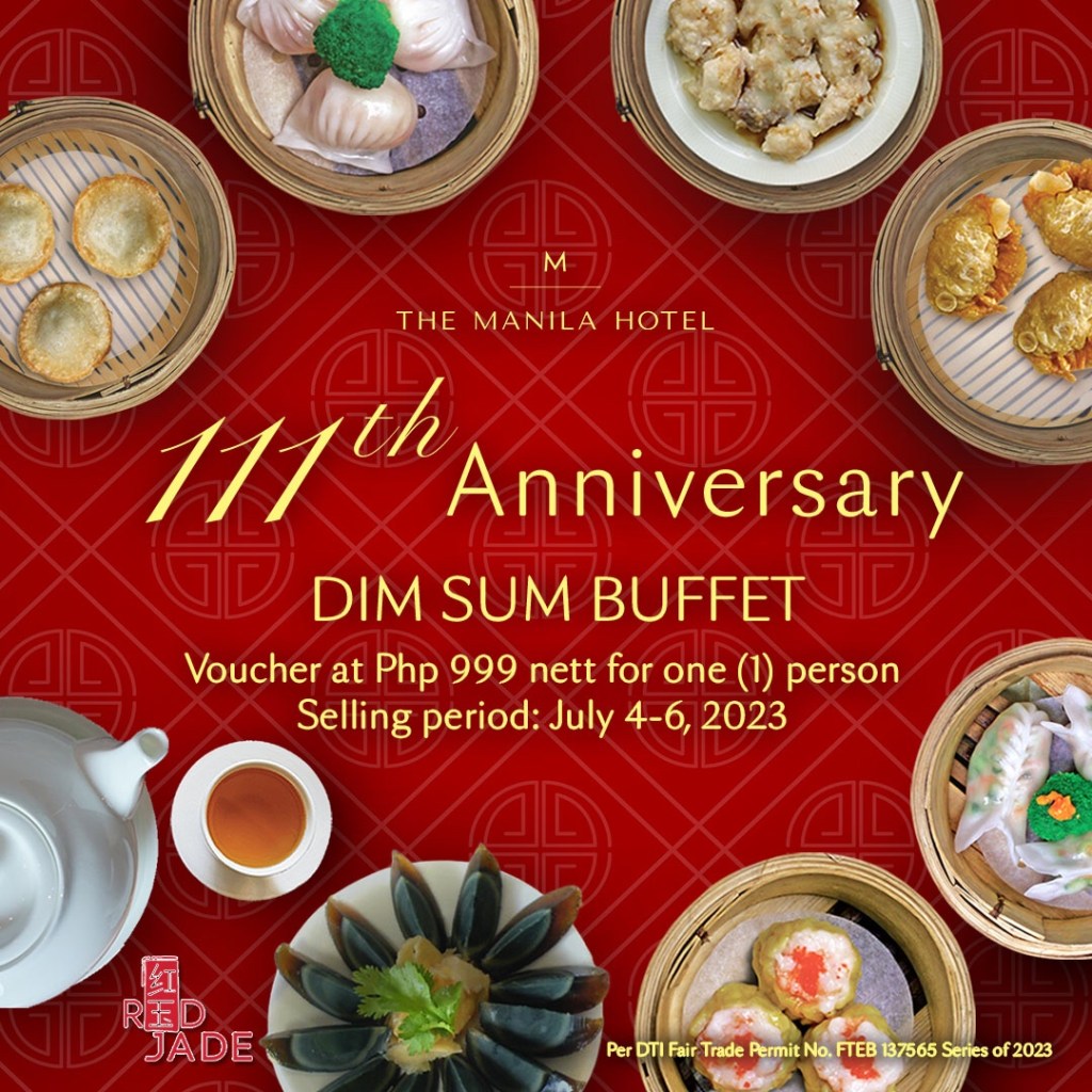 Celebrate The Manila Hotel’s anniversary with a delectable treat at Red Jade. From July 4 to 6, guests can purchase Dim Sum Buffet vouchers at a discounted rate of Php 999 per person and enjoy an authentic Chinese feast that includes freshly prepared steamed siomai, shrimp dumpling, xiao long bao, pan-fried taro cake sausage, and chestnut bun, among others. The feast comes with a choice of appetizer, soup, cold cuts, and noodles. Dim Sum Buffet is available from Monday to Friday, 11 am to 2:30 pm. For inquiries, guests can call 632 8527 0011 or email restaurantrsvn@themanilahotel.com. Terms and conditions apply.