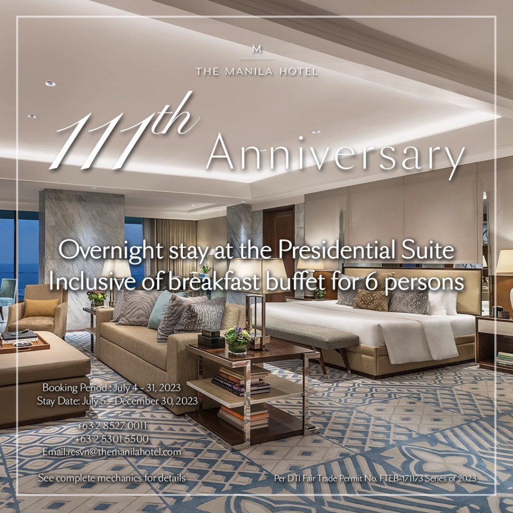 As part of its anniversary celebration, The Manila Hotel is offering a luxurious stay in its Presidential Suite. From the spacious living area to the elegantly designed rooms and breathtaking views of Manila Bay and Intramuros, every corner of the Presidential Suite exudes elegance and comfort. For a special rate of Php 111,000+++ per night, guests can enjoy an overnight stay, buffet breakfast in Café Ilang-Ilang for six (6) persons, complimentary mini bar, and a 24-hour butler service. Booking period is from July 4 to 31, while stay period is from July 5 to December 30. For bookings and inquiries, guests can call 632 8527 0011 local 1174-1179 or email resvn@themanilahotel.com. Terms and conditions apply.
