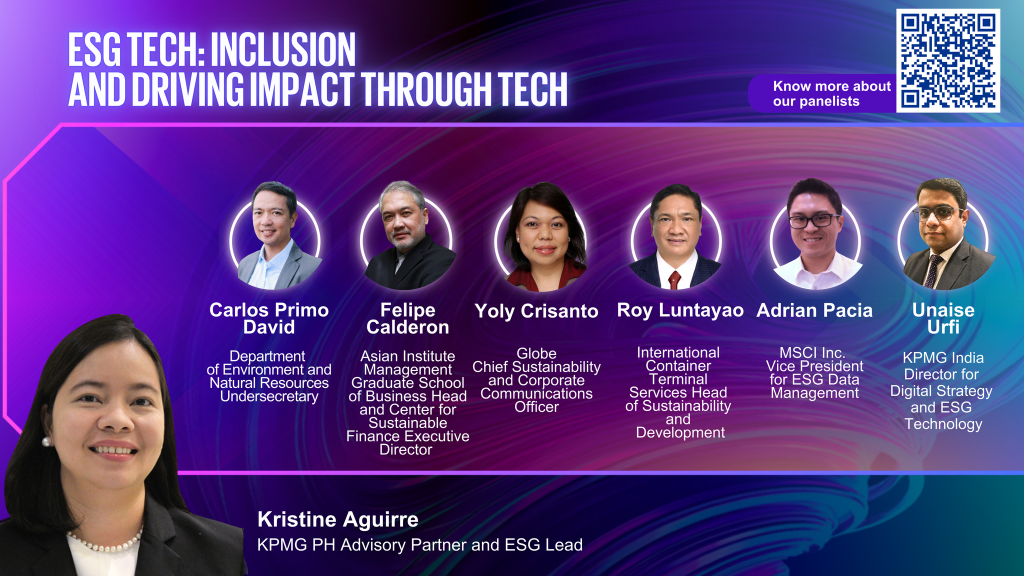 KPMG in the Philippines Advisory Partner and ESG Lead Kristine Aguirre leads the panel discussion on the industry’s important role in enabling ESG adoption to make it easier for businesses to embed ESG models into their operations. Joined by ESG Tech panelists KPMG India Director for Digital Strategy and ESG Technology Unaise Urfi, Department of Environment and Natural Resources Undersecretary Carlos Primo David, Asian Institute Management Graduate School Business Head Communications and Center for Sustainable Finance Executive Director Felipe Calderon, Globe Chief Sustainability and Corporate Communications Officer Yoly Crisanto, International Container Terminal Services (ICTSI) Head of Sustainability and Development Roy Luntayao, and MSCI Inc. Vice President for ESG Data Management Adrian Pacia will delve into how technologies offer solutions to address current ESG issues.