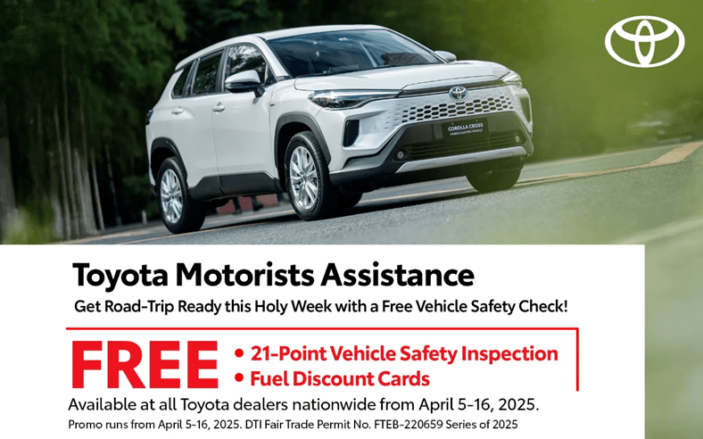 For more information on the Pre-Holy Week motorist assistance, visit https://www.toyota.com.ph/promos/free-safety-inspection-pre-holy-week-2025 or inquire at your nearest Toyota dealership.