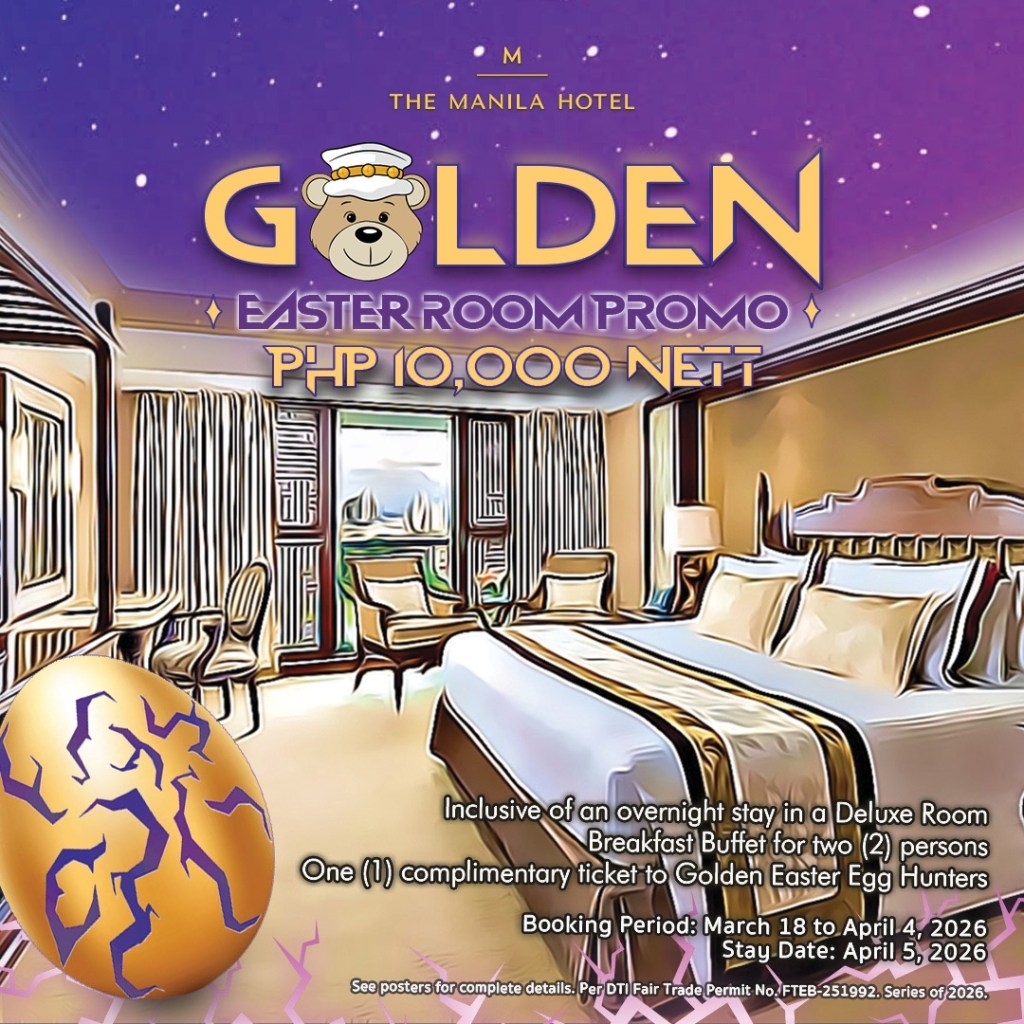 Guests who wish to extend the celebration can book the Golden Easter Room Promo, a limited-time offer priced at Php 10,000 nett. The package includes an overnight stay in a Deluxe Room, breakfast buffet for two at Café Ilang-Ilang, and one complimentary ticket to the Golden Easter Egg Hunters event. Booking is open until April 4, 2026, with the stay date on April 5, 2026. For reservations, email resvn@themanilahotel.com, or call +632 8527 0011 or +632 5301 5500.