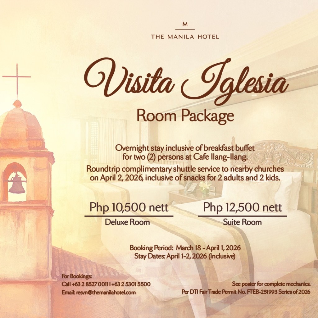 Both packages include breakfast buffet for two at Café Ilang-Ilangand slots to the Visita Iglesia tour for two adults and two kids. Booking is available until April 1, 2026, with stay dates from April 1 to 2, 2026 inclusive. For reservations, email resvn@themanilahotel.com, or call +632 8527 0011 or +632 5301 5500.